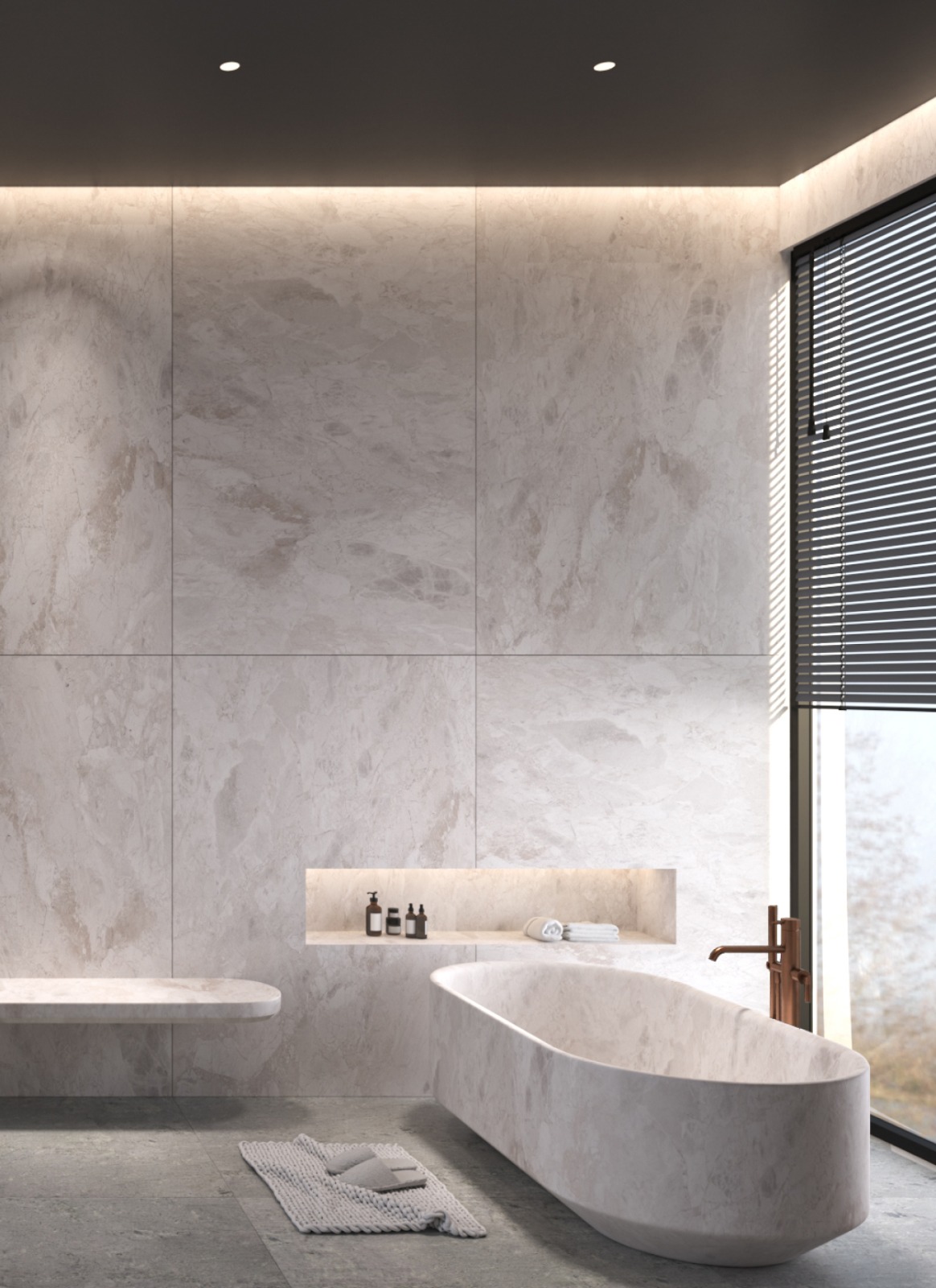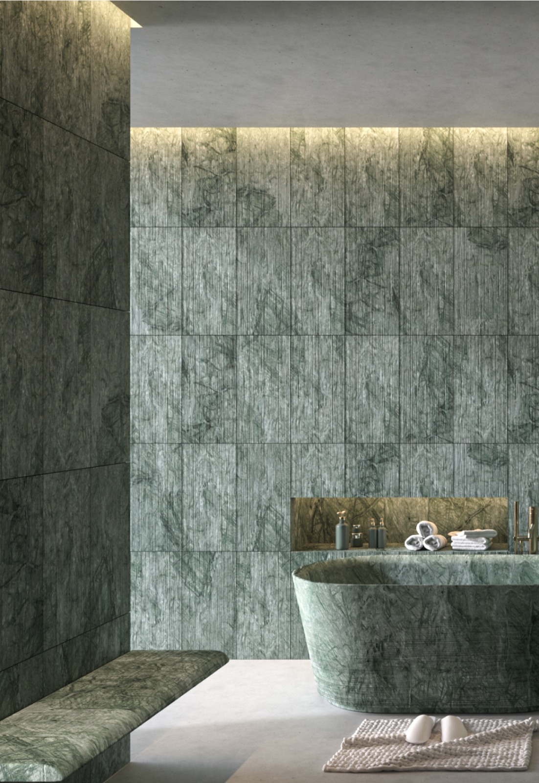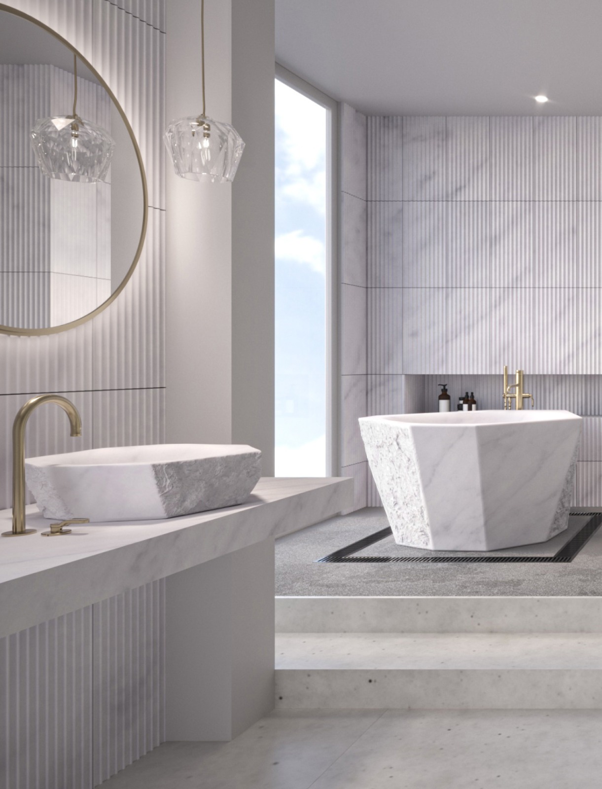 Borrowed Earth’s new Bath Collection celebrates the union of nature’s beauty and human craftsmanship. Featuring a range of monolithic tubs, freestanding washbasins, vanities, shower trays, and benches, each piece is carved from exquisite stones like Taj White Marble, Lavender Hue Marble, Black Wave Marble, Guatemala Green, and Crema Limestone.