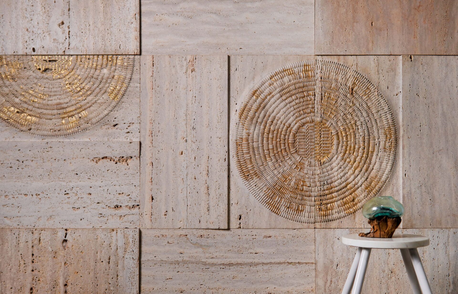 Weave with rhythmic forms carved in travertine. Available through Laura Michaels Design, lauramichaelsdesign.com, borrowedearthcollaborative.com.