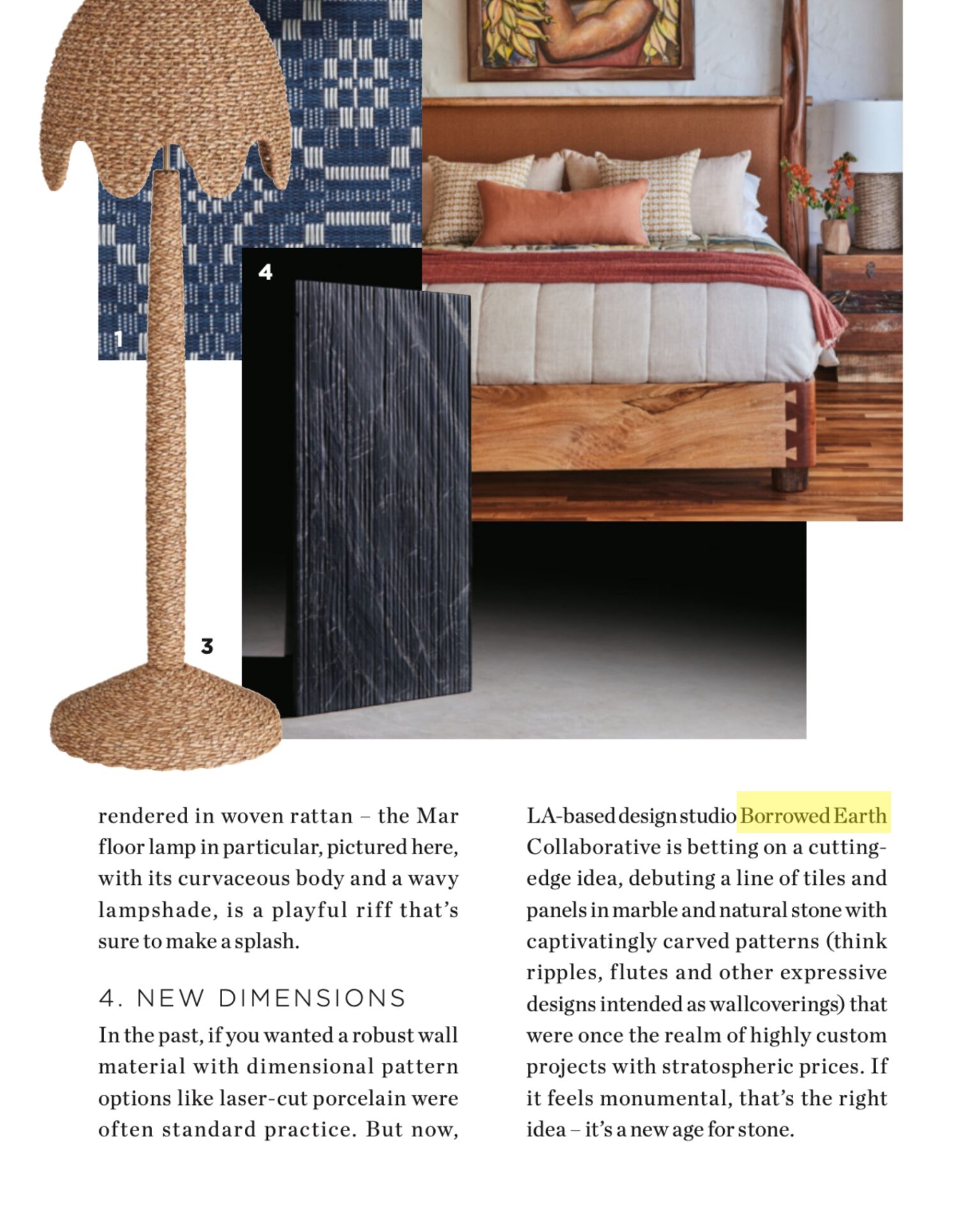 In the past, if you wanted a robust wall material with dimensional pattern options like laser-cut porcelain were often standard practice. But now, LA-based design studio Borrowed Earth Collaborative is betting on a cutting- edge idea, debuting a line of tiles and panels in marble and natural stone with captivatingly carved patterns (think ripples, flutes and other expressive designs intended as wallcoverings) that were once the realm of highly custom projects with stratospheric prices. If it feels monumental, that’s the right idea – it’s a new age for stone.