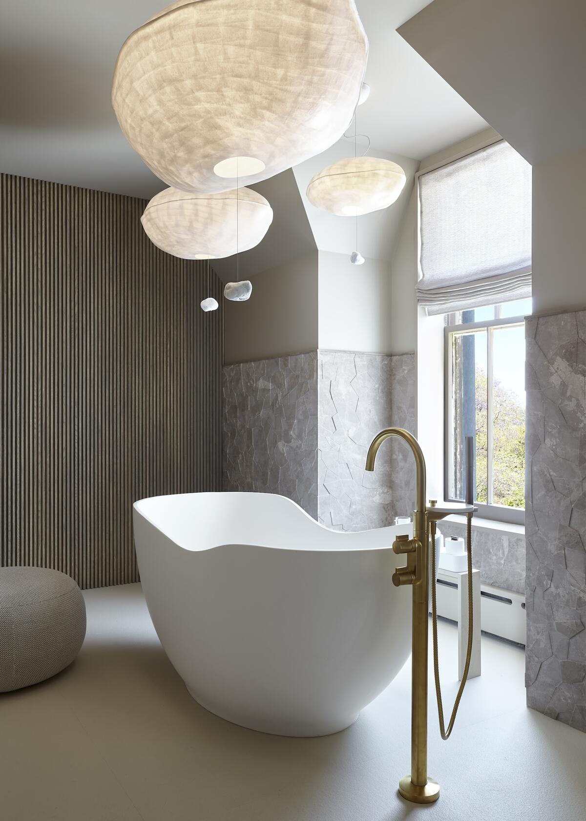 Though she still serves as a creative director for the company, Grover decided to turn her attention to the American market in 2018. Five years later, she unveiled the Borrowed Earth brand at the Kitchen & Bath Industry Show in Las Vegas, presenting an assortment of sumptuous stone collections, including the heavily veined Impression series and the fluted Architectonic line. The collection features a variety of applications, such as tile, panels and brick, as well as naturally dreamy colorways, from lavender-hued marble to rich beige travertine. “A diverse palette is integral for a surface-centric collaborative,” she says. “I lean toward achieving the diversity through tonal difference and textures, which are accentuated through the carving and hand-finishing process.”