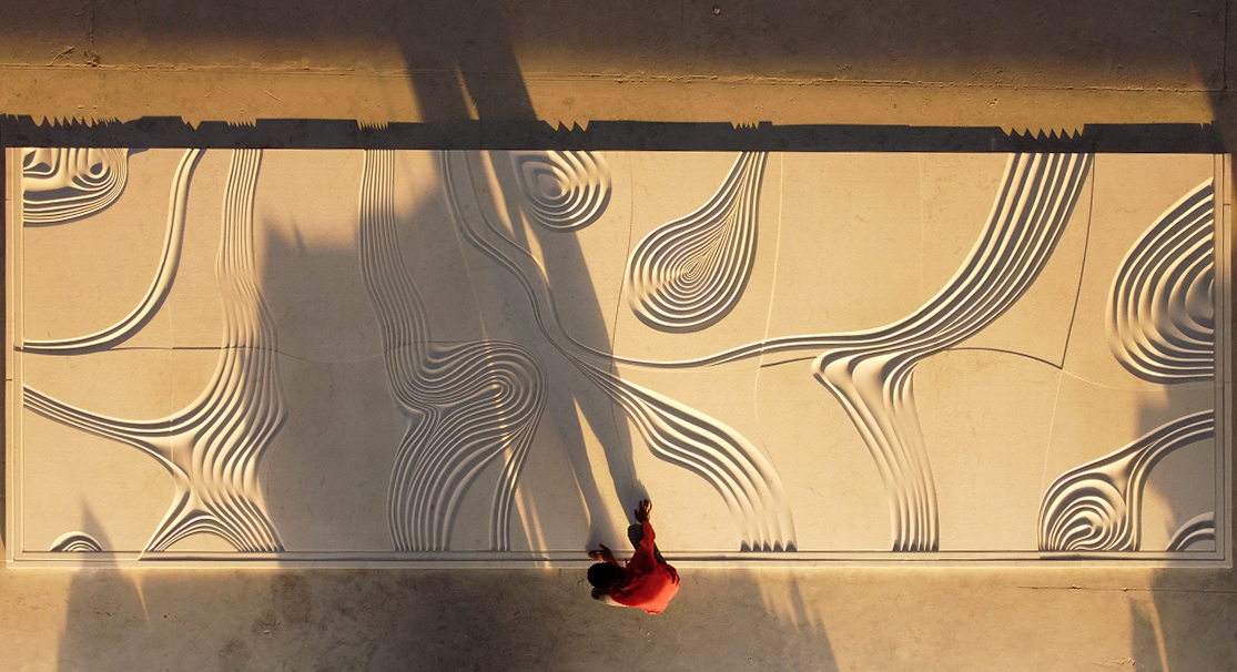 neither vertical nor horizontal, but along the path of movement. This seamlessness erases the idea of tiles, replacing it with the experience of an uninterrupted gesture, like the pull of tides across ocean beds.