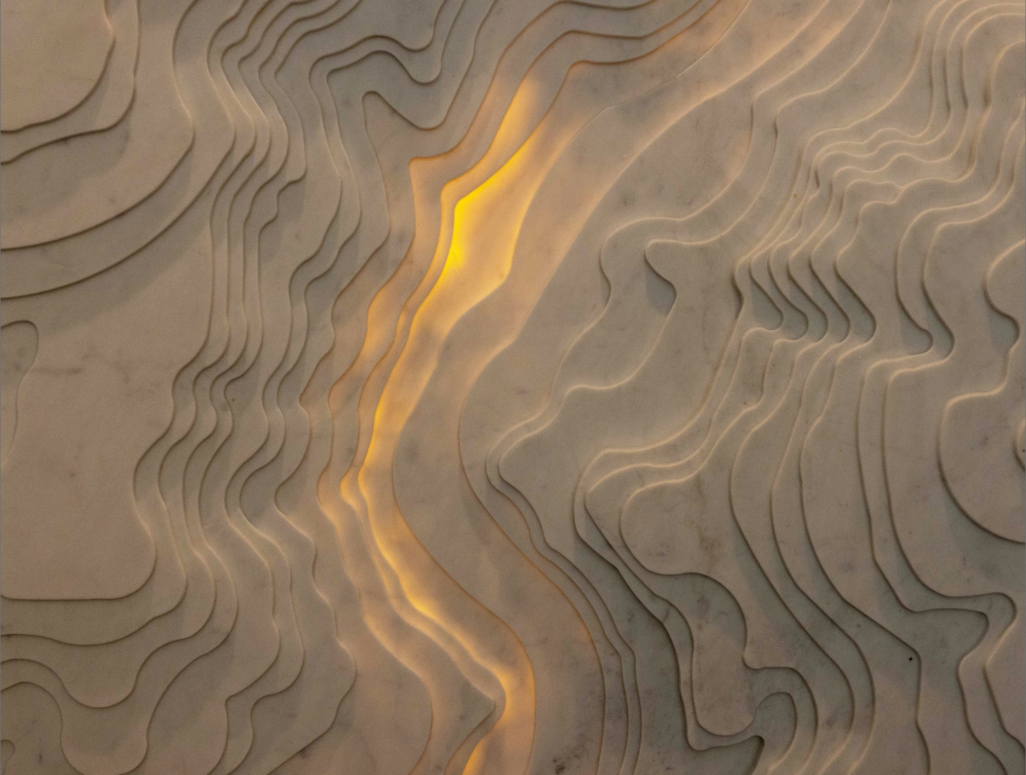 The physical representation of the Earth’s surface derives inspiration from land-form contours.